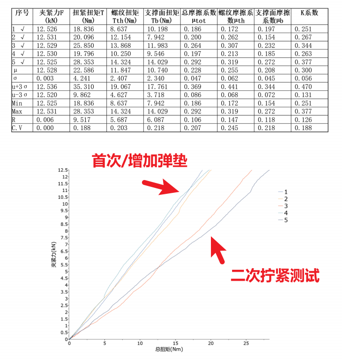 实验1为不增加弹垫,实验2和4为增加弹垫。实验3和5为在有弹垫的测试样件上二次测试。结果表现,增加使用弹垫对摩擦系数的影响比较小。二次拧紧与上述章节1的情况类似。