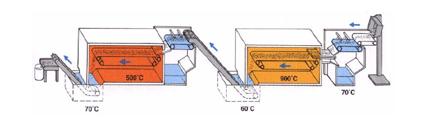 ​调质热处理具体包含两个步骤:第一步是淬火,即把产品加热到特定的高温,并保持一段时间后迅速进行冷却,以此来获得马氏体组织;第二步是回火,通过回火使马氏体组织的硬度趋于适度,进而提升产品的韧性。部分产品对表面硬度和耐磨性有着极高要求,比如气门弹簧座上的气门弹簧垫就是这类产品。针对此类产品,通常采用表面硬化的热处理工艺。表面硬化可通过感应淬火、渗碳、渗氮、碳氮共渗等多种方式实现。在这些方式中,最常见的渗碳工艺是通过调控淬火炉内的碳势,提高气氛中的含碳量,从而达成表面硬化的效果。无论是进行调质处理还是渗碳处理,大多会使用连续热处理炉,如下图所示。