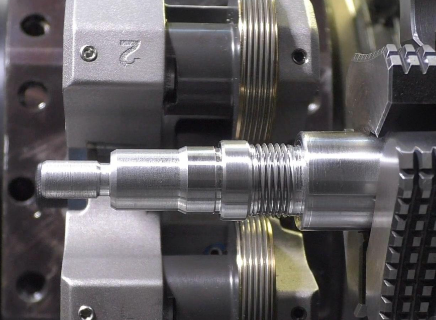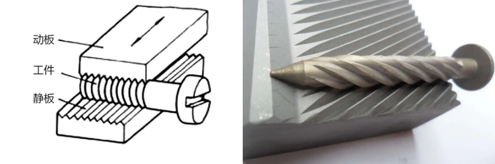 ​另外还有一种搓牙方式叫滚牙,即零件光坯在由两个轮或三个轮构成的滚牙板中受到挤压并向前行进,从而形成螺纹。滚牙这种方式适用于螺纹心部带有孔的零件,与平面搓牙相比,滚牙时孔不容易出现变形情况,不过滚牙的加工速度要比平面搓牙慢许多。