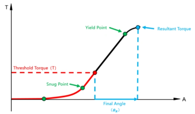 作为前沿控制技术,该方法突破传统阈值设定思维,通过捕捉螺栓塑性变形临界点实现预紧力最大化利用。当扭矩-角度曲线斜率发生突变(即材料开始屈服时),系统自动终止紧固或增加某个角度来控制材料处于屈服阶段。此方法能充分发挥材料强度潜能,使连接结构在安全范围内达到最优承载状态,尤其适用于轻量化设计要求下的高强螺栓应用,如新能源汽车底盘或风电塔筒连接。但需配合高灵敏度传感器与实时数据分析系统,目前多用于高端定制化产线。