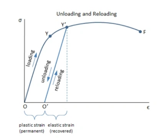 螺栓在拧紧至屈服时会产生应变硬化。什么是应变硬化呢?如下图所示,第一次加载,使应力超过屈服强度Y,达到Y',然后卸载。再次加载时,应力应变曲线的线性段会延伸到之前加载的最大载荷所对应的位置,屈服强度提高到Y'。