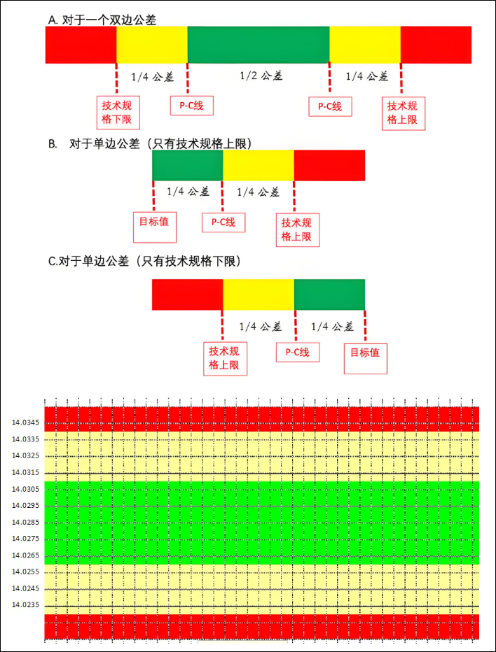 预控图(彩虹图)是简单地划分产品的尺寸规格上下限(不同区间划分为绿色、黄色、红色)来对产品进行尺寸范围进行监控,当尺寸出现进入红色区域或连续进入黄色区域便要引起关注排除问题。预控图需要在过程受控前提下使用,即首先确保生产过程是稳定受控的(使用控制图来分析),然后再使用。