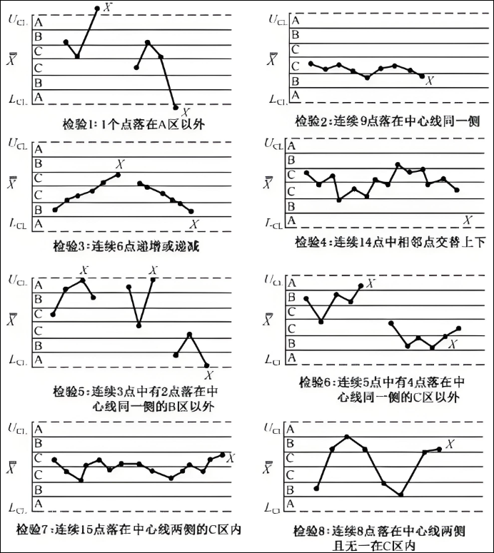 定时巡检判断尺寸是否合格,前提也是过程受控。但这种方式无法明确分析出过程中可能存在的问题并进行提前干预改善。例如:使用控制用控制图,如果控制图中出现8种异常模式,即使产品尺寸合格也应该引起关注进行干预。