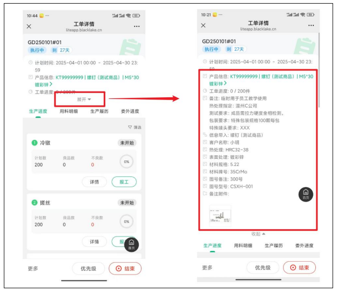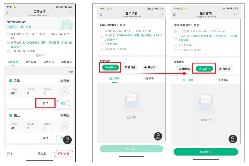 3、选择对应的工序,点击对应的工序详情,更改任务状态。(代表我已经开始这道工序任务了)