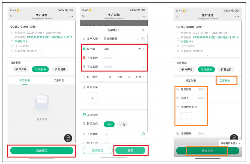 4、对应工序的报工(或者报告)。可以多次进行报工,也可以多次去修改报告。