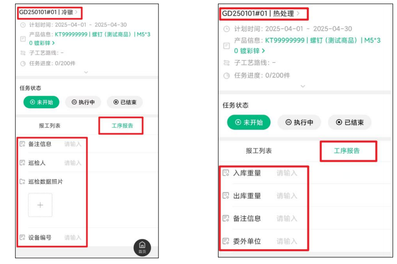 当产品的流转卡留转到对应的工序的时候,工序的负责人需要对该工序进行报工报告。(简单说就是完工后需要填写完成了多少,以及拍照上传该工序需要上传的一些文档、照片等数据。)