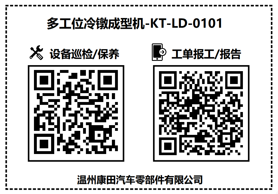 如果要保障产品质量稳定,要求机器要保持在一个良好状态,必须要进行定期的检查和保养。设备巡检和保养二维码用于记录设备的巡检和保养记录。