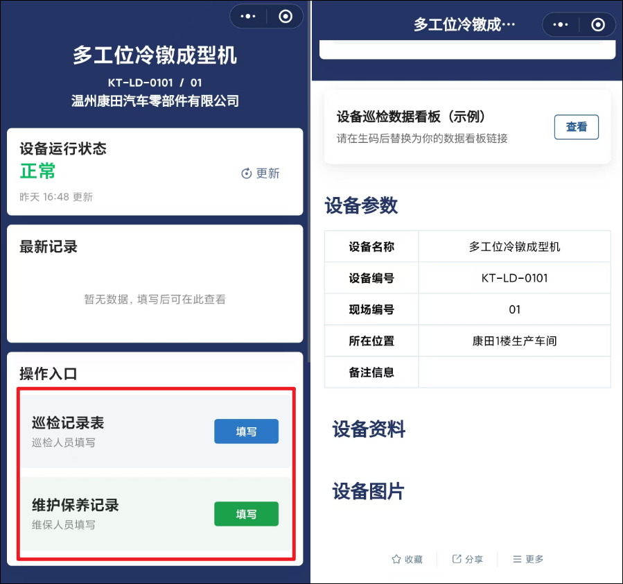 1、扫描进入后选择对应的操作(巡检或保养),其余部分则是这台设备的相关信息。
