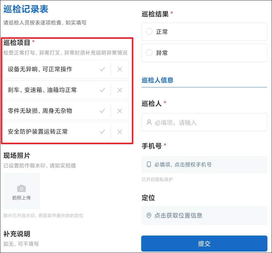 2、如果选择的是巡检记录,需要对巡检项目进行勾选确认。注意标有红色星号键的为必填项。巡检检查结束需要点击提交按钮进行提交。
