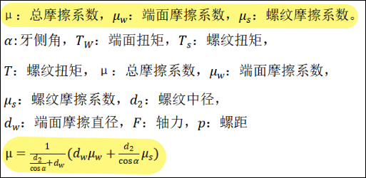 摩擦系数,可分为总摩擦系数、螺纹摩擦系数、端面摩擦系数,目前很多OEM,对这三种摩擦系数均要求控制在范围内。三种摩擦系数满足一定的公式对应关系。(参考公式)