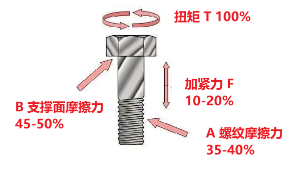 螺栓,通过螺纹将零件连接在一起。目的之一就是提供足够可靠的加紧力。但是在螺栓紧固的过程中,只有约10-20%的扭矩力T最终会转变为需要的夹紧力F。其余的会与摩擦力相互抵消。