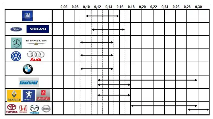 扭矩系数中摩擦系数是最主要的部分。摩擦系数是紧固件的一项重要参数,对螺纹连接轴力和扭矩的稳定性至关重要。各主机厂对紧固件的摩擦系数都给了具体的数值定义,如下图所示。
