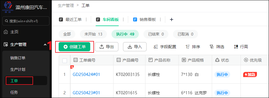 3.1 进入生产管理的工单模块,点击创建工单按钮。