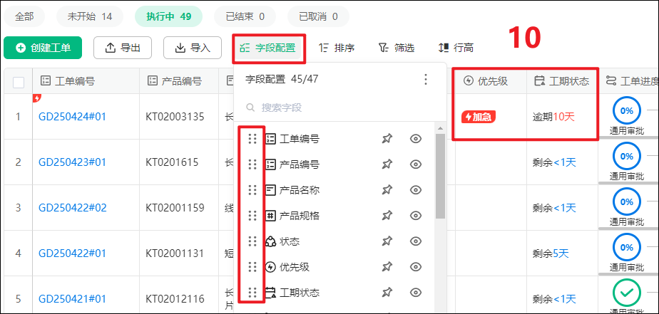 计划管理者在网页端可以根据所需的关注点,显示和排序工单的字段。对需要进行加急的工单进行加急标注,对逾期的工单进行周期管控。