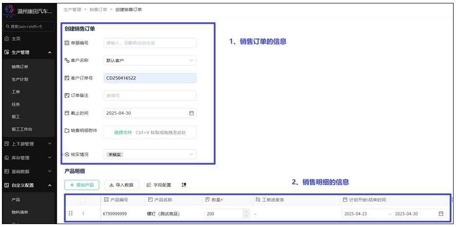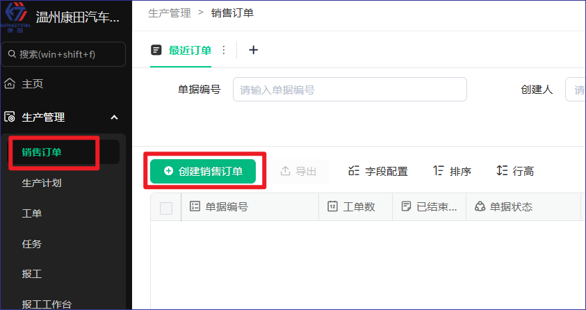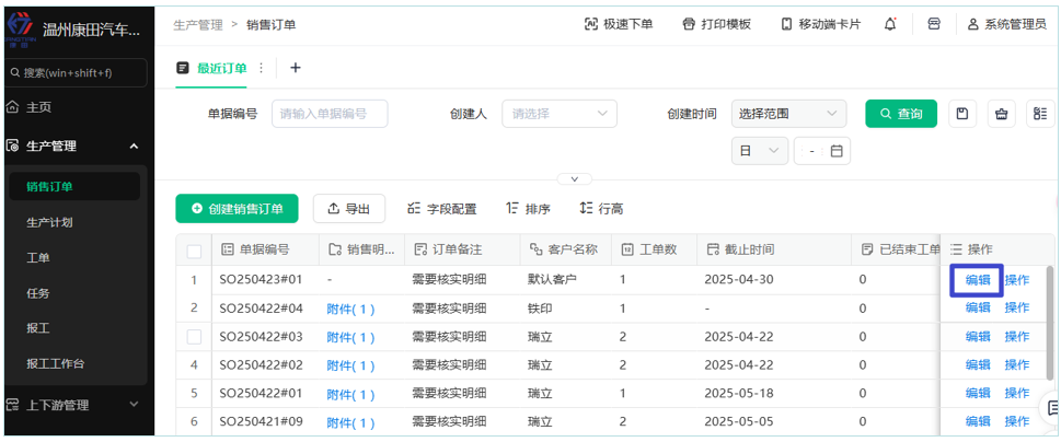 1、在(生产管理)销售订单模块创建销售工单【销售负责】