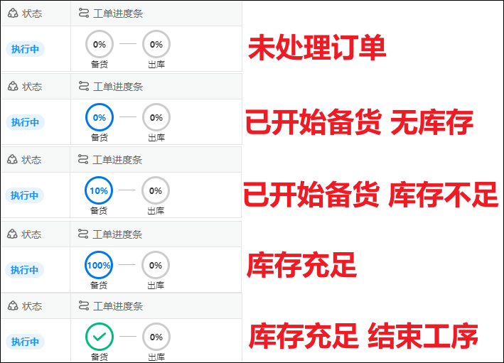 我们使用子工单中的备货工序,来确认核实是否有库存,以及是否需要进行备货。备货人对存货情况以及需求情况进行比对,如果库存充足(报工100%并完成备货工序),如果库存不足也需要进行报工(开始此工序,代表已经有进行备货,此工序备货执行比例代表当前库存可满足订单需求情况。)