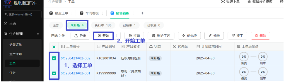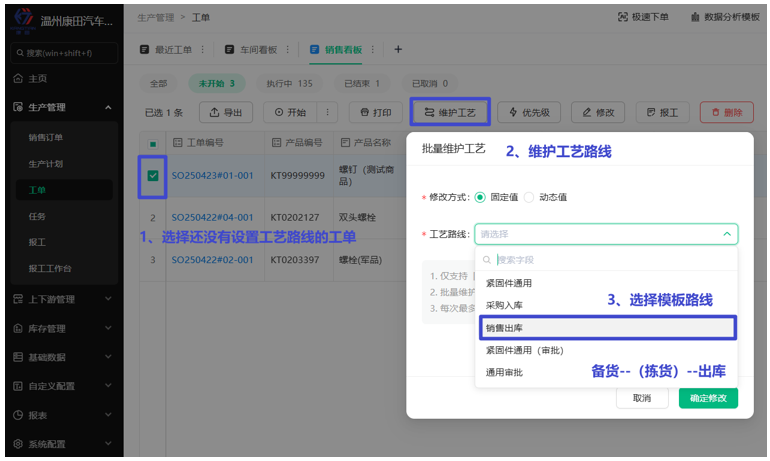 创建好的销售订单,会自动为每个子产品创建工单,工单出现在“销售看板”的未开始列表里。这些工单都是没有指定工艺路线的,需要手动多选进行工艺路线的维护。(建议在核实或打印销售单后就维护工艺路线)